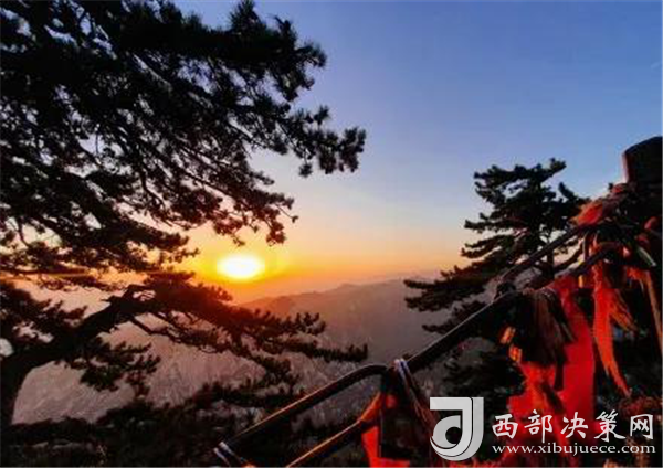 是時,但見夜幕自東方悄然隱退,晨曦初露,漸漸霞光瑰麗,云源奔涌。瞬間,一輪火球噴薄而出,繼而光芒四射,氣象萬千,整個世界大放光明,游人身心為之一振。待云霧散盡,蒼松翠柏,則更加清麗悅目,美妙神奇。故而,游名山者必登華山,登華山者必觀日。華山日出亦被列為華山自然風(fēng)光中的重要景觀之一。