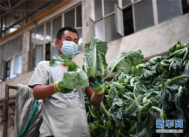 7月18日,在烏魯木齊市沙依巴克區(qū)新疆九鼎農(nóng)產(chǎn)品批發(fā)市場,一商戶整理蔬菜。 新華社記者 宋彥樺 攝