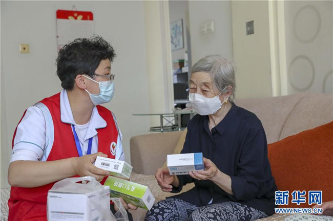 烏魯木齊市沙依巴克區(qū)騰威社區(qū)的志愿者為獨(dú)居老人送來蔬菜和常用藥品(7月18日攝)。 新華社發(fā)(陳宇 攝)