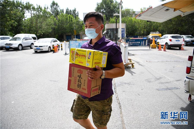 7月18日,在烏魯木齊市新市區(qū)一小區(qū)外,工作人員將生活用品送往小區(qū)。 新華社記者 宋彥樺 攝