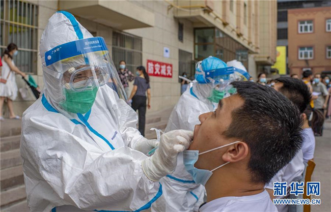 7月17日起,烏魯木齊市開始對全市居民進(jìn)行免費(fèi)核酸檢測,重點(diǎn)人群所在社區(qū)要實(shí)現(xiàn)100%檢測。家住天山區(qū)光北社區(qū)的63歲居民雷雙蘭說:“19日社區(qū)挨戶通知下樓排隊(duì)檢測,大家都戴著口罩,前后保持一米安全距離,一家人幾分鐘就檢測完了。”