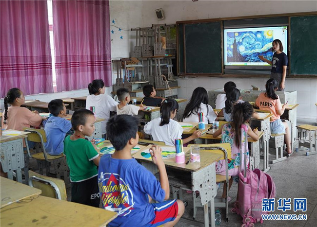 7月23日,在廬山市蛟塘鎮(zhèn)中心小學(xué)安置點(diǎn),老師給孩子們講解美術(shù)作品。新華社記者 張浩波 攝