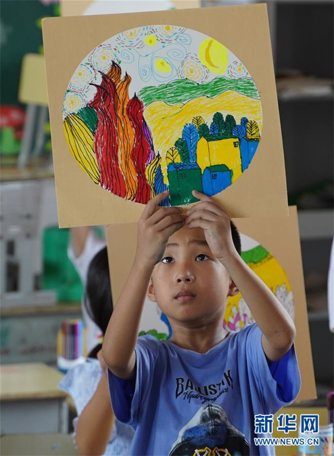 7月23日,在廬山市蛟塘鎮(zhèn)中心小學(xué)安置點(diǎn),一名小朋友展示自己的繪畫(huà)作品。新華社記者 張浩波 攝