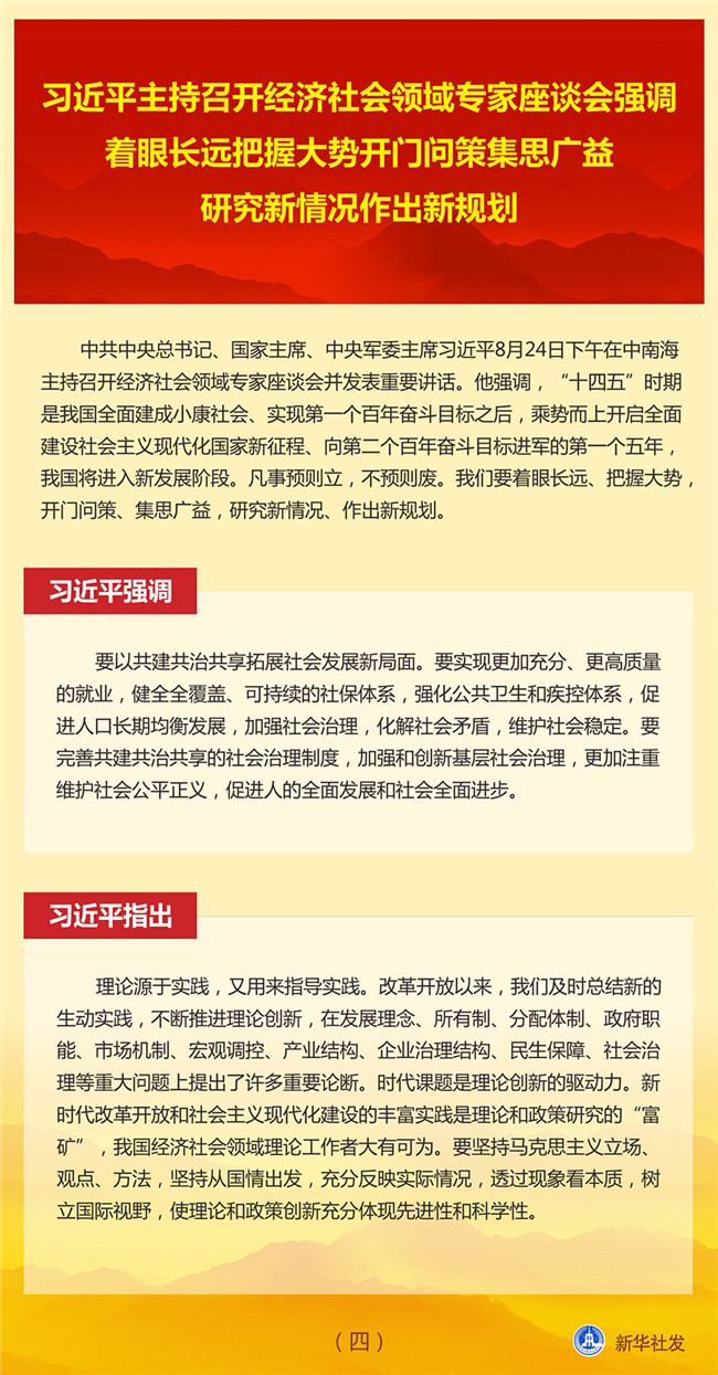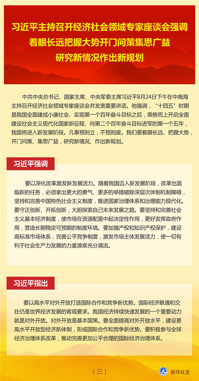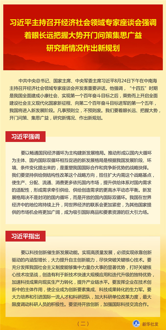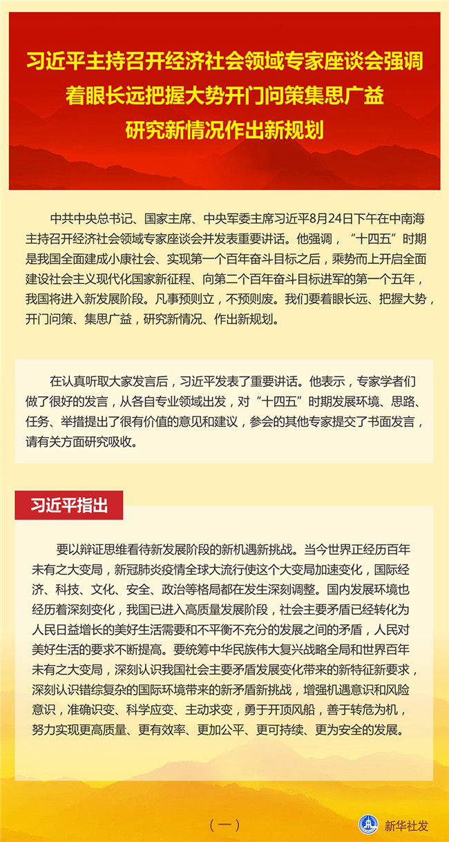 中共中央總書記、國家主席、中央軍委主席習(xí)近平8月24日下午在中南海主持召開經(jīng)濟社會領(lǐng)域?qū)<易剷l(fā)表重要講話。他強調(diào),“十四五”時期是我國全面建成小康社會、實現(xiàn)第一個百年奮斗目標之后,乘勢而上開啟全面建設(shè)社會主義現(xiàn)代化國家新征程、向第二個百年奮斗目標進軍的第一個五年,我國將進入新發(fā)展階段。凡事預(yù)則立,不預(yù)則廢。我們要著眼長遠、把握大勢,開門問策、集思廣益,研究新情況、作出新規(guī)劃。
