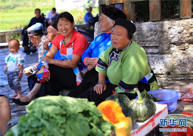 8月25日,在貴州安順鮑家屯,村民在大樹下乘涼賣菜。新華社記者 劉續(xù) 攝