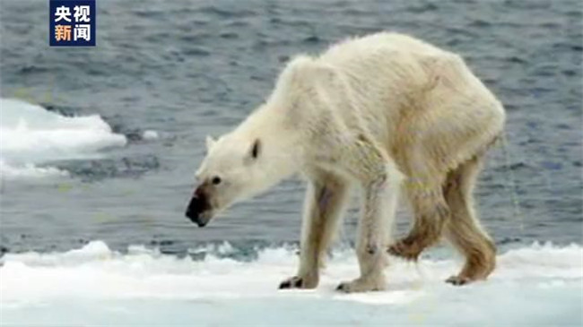 ▲圖為德國攝影師于2015年拍攝到的一只瘦骨嶙峋的北極熊。圖片來源:央視新聞。
