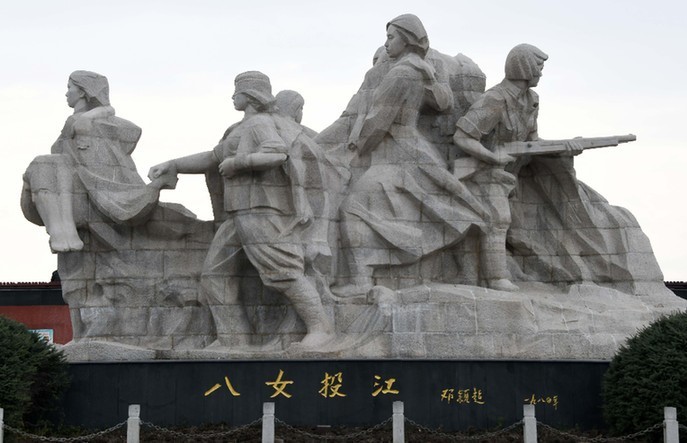 她們是東北抗日聯軍第5軍婦女團的政治指導員冷云,班長胡秀芝、楊貴珍,戰(zhàn)士郭桂琴、黃桂清、王惠民、李鳳善和被服廠廠長安順福。1938年10月,該部在牡丹江地區(qū)烏斯渾河渡口與日偽軍千余人遭遇。已行至河邊準備渡河的婦女團8名成員,為掩護大部隊突圍,毅然放棄渡河,在冷云率領下,分成3個戰(zhàn)斗小組,與日偽軍展開激戰(zhàn)。她們主動吸引日偽軍火力,使部隊主力得以迅速擺脫敵人的攻擊,但她們卻被敵人圍困于河邊。在背水作戰(zhàn)至彈盡的情況下,面對日偽軍逼降,女戰(zhàn)士們誓死不屈。她們毀掉槍支,挽臂涉入烏斯渾河,高唱著《國際歌》,集體沉江,壯烈殉國。犧牲時,她們年齡最大的冷云23歲,最小的王惠民才13歲。