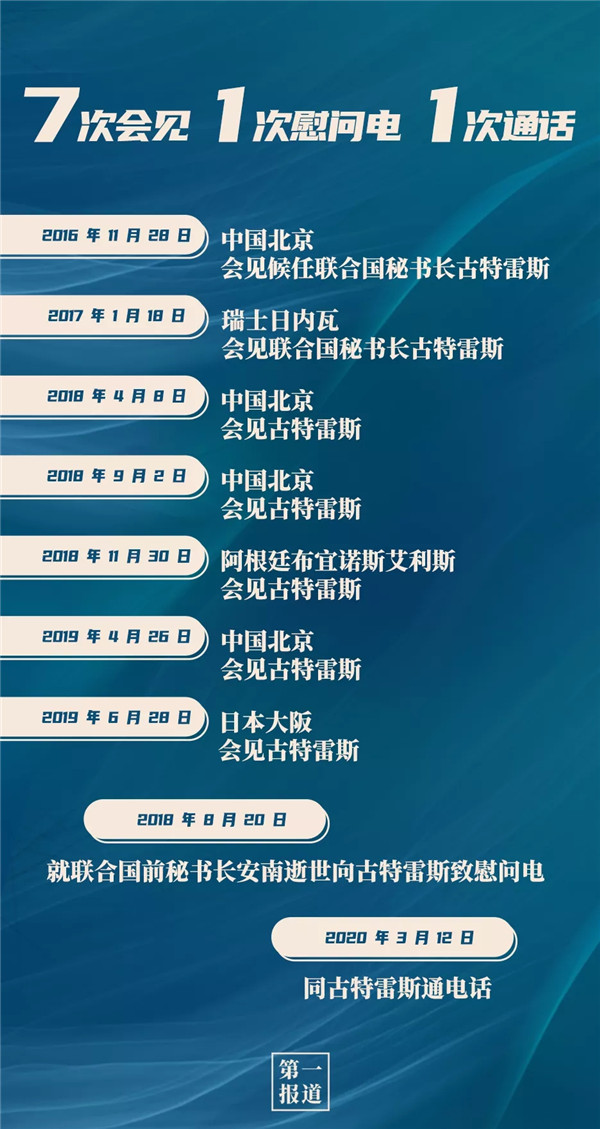 其中,習主席同聯(lián)合國“掌門人”的交往互動最為頻繁,截至目前,習主席已7次會見聯(lián)合國秘書長古特雷斯。今年,在全球暴發(fā)新冠疫情的特殊情況下,習主席還通過“電話外交”同古特雷斯保持溝通交流: