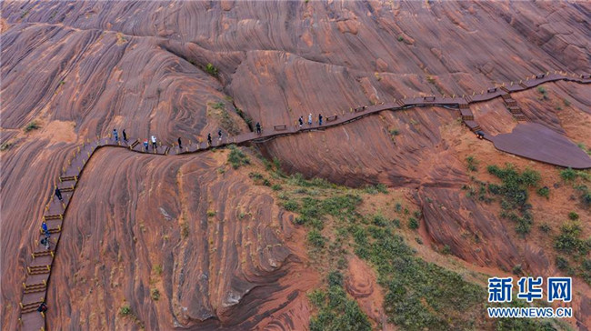 游人在靖邊縣龍洲鎮(zhèn)波浪谷丹霞景區(qū)游覽(9月26日攝,無人機照片)。新華社記者 陶明 攝