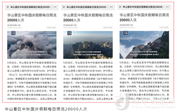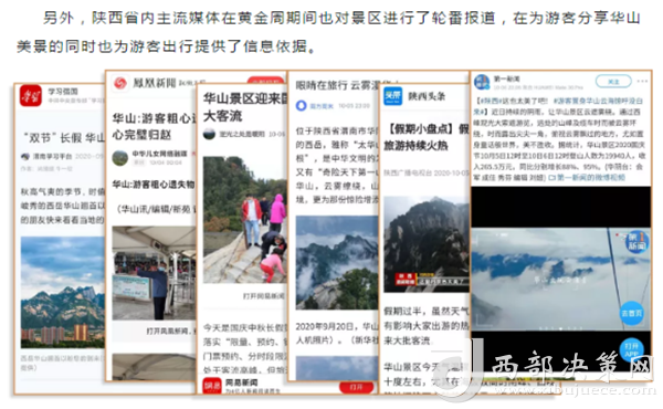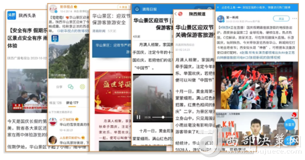 度節(jié)期間,通過央視cctv2【天下財經(jīng)】、cctv4、cctv13【新聞30分】、cctv13【新聞直播間】、央視網(wǎng)【國慶假期·出游】、央視網(wǎng)學(xué)習(xí)強(qiáng)國、央視新聞客戶端、新華社等國家級媒體對景區(qū)度節(jié)工作、游覽秩序、特色服務(wù)等方面進(jìn)行轟炸式報道;聯(lián)合陜西日報、陜西電視臺、渭南日報、渭南電視臺、三秦都市報、陜西旅游資訊、騰訊網(wǎng)、新浪網(wǎng)、網(wǎng)易陜西、鳳凰陜西等30余家主流媒體對景區(qū)度節(jié)期間各項工作及實時風(fēng)景進(jìn)行跟蹤報道,共計發(fā)布各類宣傳稿件239篇,全面提升景區(qū)旅游熱度。