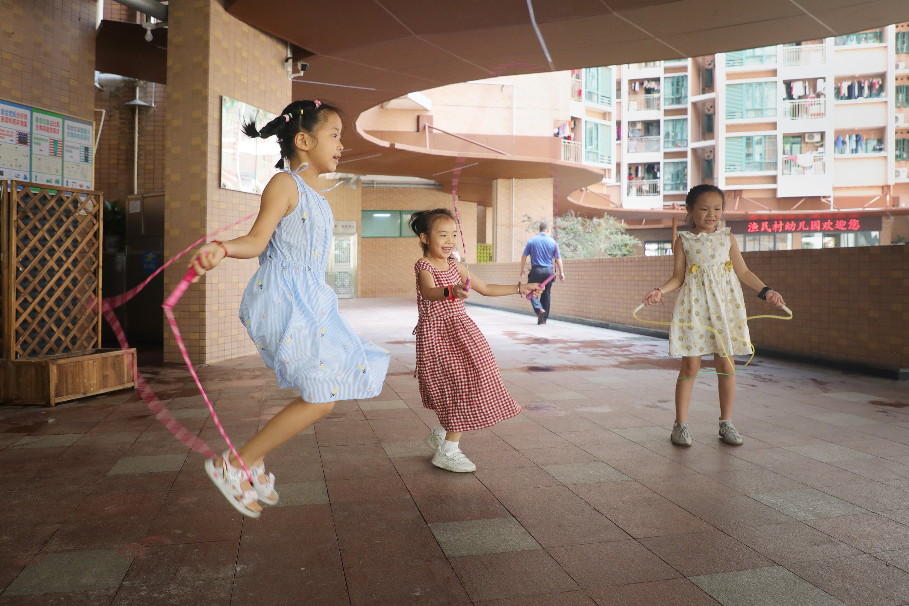 ▲2020年8月24日,深圳漁民村,小朋友跳繩玩耍。