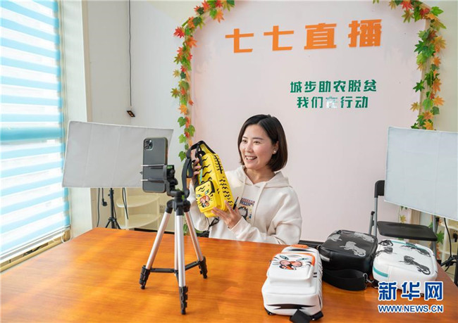 10月13日,在湖南省邵陽市城步縣湖南七七科技股份有限公司,殘疾女青年楊淑亭通過網(wǎng)絡(luò)銷售背包。1991年出生的苗族姑娘楊淑亭因車禍胸部以下高位截癱,通過不斷學(xué)習(xí)摸索,開辦網(wǎng)店并注冊(cè)了自己的企業(yè),與周邊貧困家庭簽訂合作協(xié)議,制作售賣具有民族特色的背包和仿真花卉,帶動(dòng)上千名貧困人員及59名殘疾人就業(yè)。