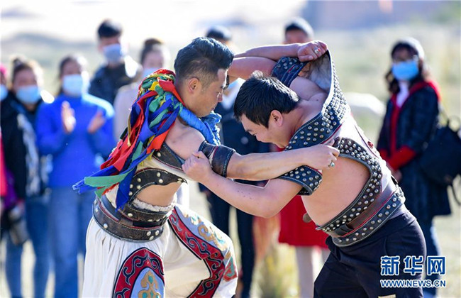 10月21日,一名游客(右)在阿拉善通湖草原旅游區(qū)民俗旅游項(xiàng)目中體驗(yàn)搏克。新華社發(fā)(王正 攝)