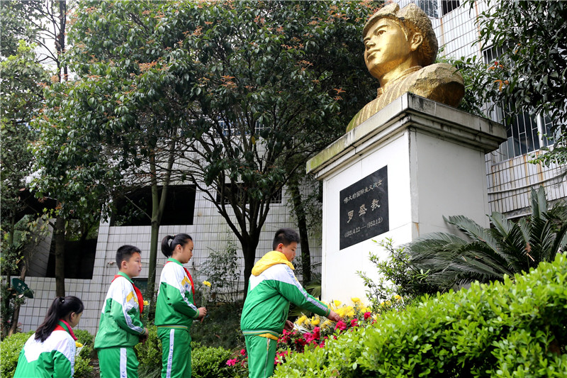 湖南吉首大學(xué)師范學(xué)院附屬小學(xué)學(xué)生在為羅盛教烈士塑像獻(xiàn)花(2016年3月31日攝)。新華社發(fā)(彭彪攝)