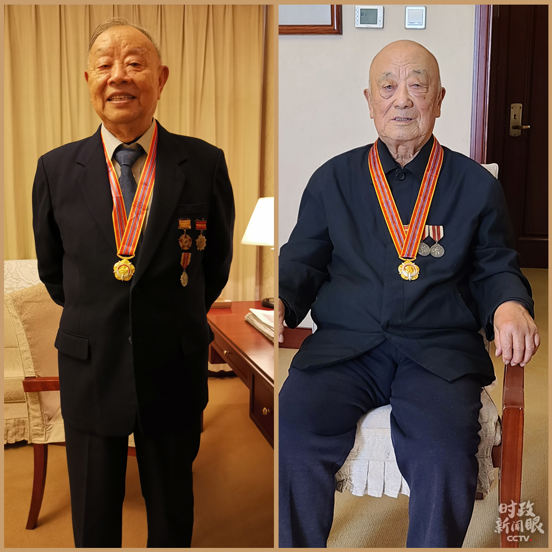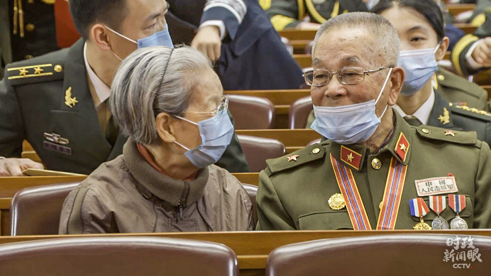 △今年86歲的張?jiān)埽ㄗ螅﹨⒓舆^上甘嶺戰(zhàn)役,榮獲三等功2次,90歲的王德啟(右)在抗美援朝期間榮立三等功4次。他們都出席了當(dāng)天的紀(jì)念大會(huì)。(總臺(tái)央視記者王曉東、趙化拍攝)