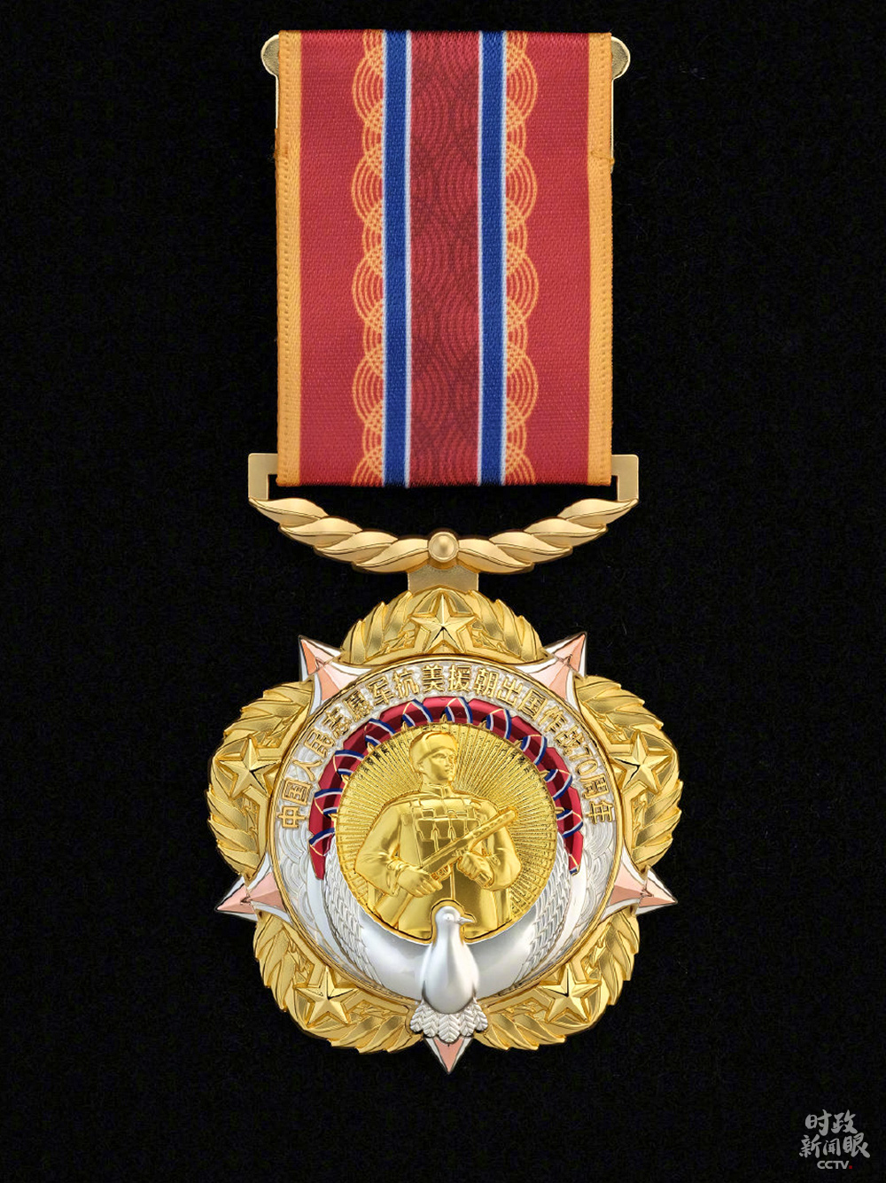 △紀(jì)念章核心部分為志愿軍戰(zhàn)士形象和70束光芒,以和平鴿、水紋和中朝兩國(guó)國(guó)旗元素編制的綬帶環(huán)繞四周。