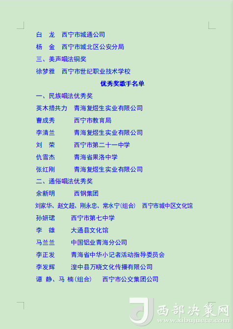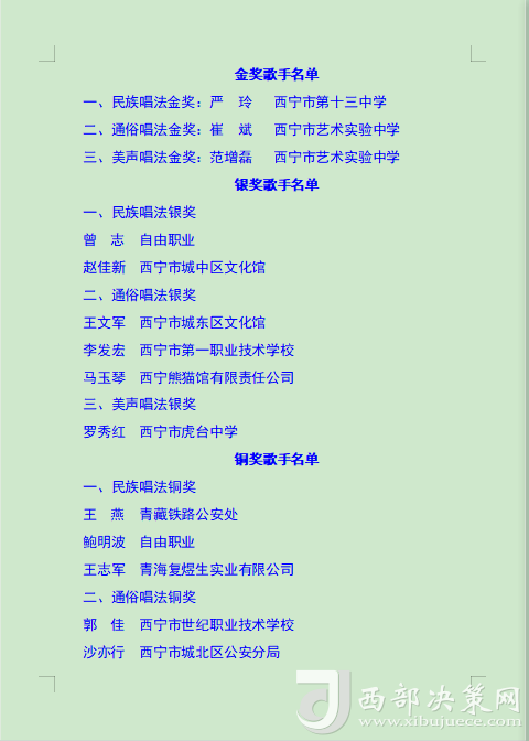 本次比賽旨在通過歌手們的激情演繹,增強(qiáng)全市廣大職工群眾的獲得感、幸福感、安全感,展現(xiàn)西寧市職工群眾的時(shí)代風(fēng)貌,進(jìn)一步營(yíng)造弘揚(yáng)勞模精神、勞動(dòng)精神、工匠精神的濃厚氛圍,為更高水平打造綠色發(fā)展樣板城市建設(shè)新時(shí)代幸福西寧增強(qiáng)信心、凝聚力量。(后附獲獎(jiǎng)名單)。