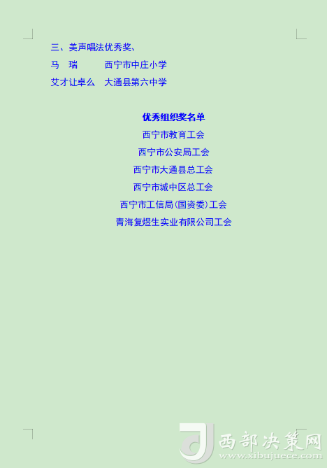 西部決策網(wǎng)訊 11月13日下午,“中國(guó)夢(mèng)•勞動(dòng)美——唱響勞動(dòng)贊歌•建設(shè)幸福西寧”西寧市職工群眾歌手大賽正式落下帷幕,本次比賽由市總工會(huì)、團(tuán)市委、市婦聯(lián)、市文聯(lián)、市殘聯(lián)、市工商聯(lián)、市科協(xié)、市紅十字會(huì)、市廣播電視臺(tái)聯(lián)合主辦,市五一工人文化宮、市職工群眾業(yè)余藝術(shù)團(tuán)承辦,來自全市各行各業(yè)職工群眾代表300余人參加了頒獎(jiǎng)典禮。同時(shí)頒獎(jiǎng)典禮現(xiàn)場(chǎng)采取直播的方式,獲得13.5萬次點(diǎn)擊、4.1萬個(gè)點(diǎn)贊。