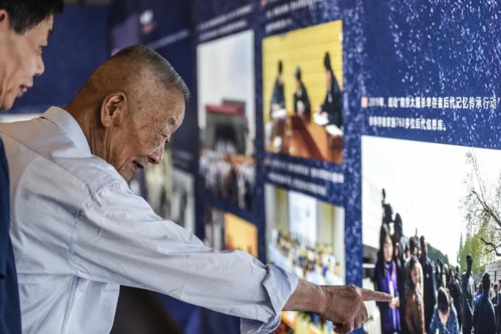△2020年8月,南京大屠殺幸存者葛道榮參觀侵華日軍南京大屠殺遇難同胞紀(jì)念館35周年回顧展。