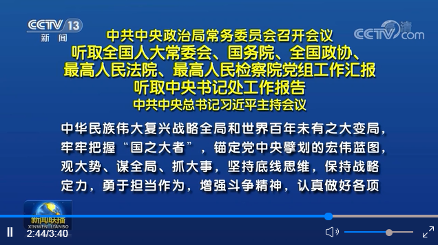 新華社北京1月7日電 中共中央政治局常務(wù)委員會1月7日全天召開會議,聽取全國人大常委會、國務(wù)院、全國政協(xié)、最高人民法院、最高人民檢察院黨組工作匯報,聽取中央書記處工作報告。中共中央總書記習(xí)近平主持會議并發(fā)表重要講話。