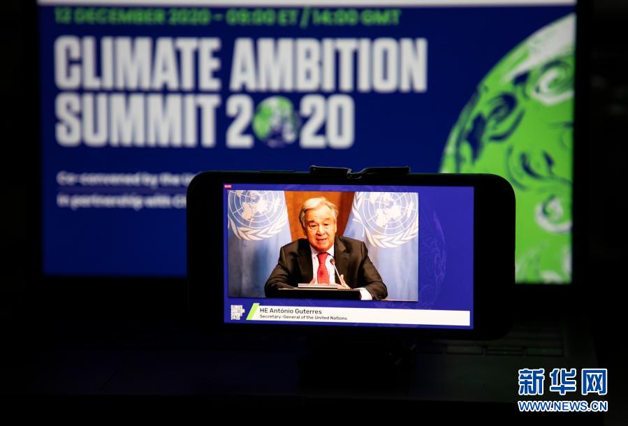 這是2020年12月12日在美國紐約拍攝的聯(lián)合國秘書長古特雷斯在氣候雄心峰會上通過視頻發(fā)表講話的屏幕畫面。氣候雄心峰會由聯(lián)合國及有關國家倡議舉辦,旨在紀念《巴黎協(xié)定》達成五周年,進一步動員國際社會強化氣候行動,推進多邊進程。新華社記者 王迎 攝