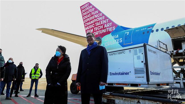 △2021年1月16日,塞爾維亞總統(tǒng)武契奇在機(jī)場迎接中國疫苗抵達(dá)。