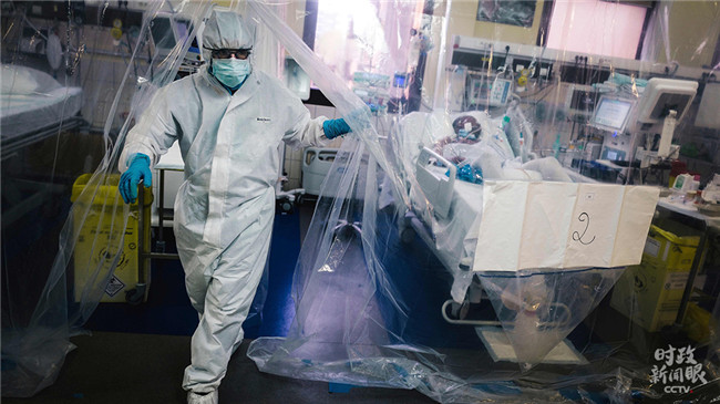 △2020年4月,法國巴黎,一名醫(yī)務(wù)人員在醫(yī)院的重癥監(jiān)護(hù)室護(hù)理一名新冠肺炎患者后走出用塑料布隔開的房間。