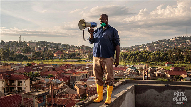 △2020年3月,烏干達(dá)坎帕拉,49歲的社區(qū)負(fù)責(zé)人貢扎加·伊加每天早晚在當(dāng)?shù)刈罡叩慕ㄖ?,通過擴(kuò)音器向居民宣傳防疫知識。