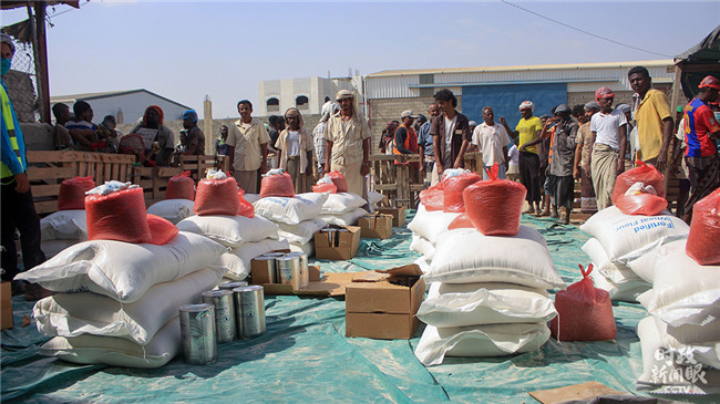 △2021年1月12日,也門哈杰,聯(lián)合國世界糧食計(jì)劃署為流離失所的難民們提供援助。