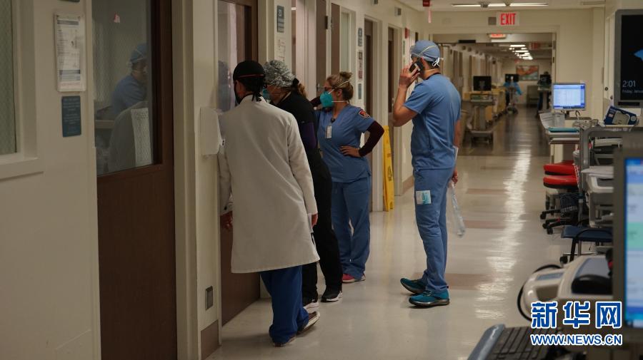 2021年1月22日,在美國(guó)加利福尼亞州蒙特貝洛市貝弗利醫(yī)院,醫(yī)護(hù)人員在“新冠病區(qū)”工作。由于新冠確診病例激增,南加州地區(qū)醫(yī)院的重癥監(jiān)護(hù)室空置率為零。新華社發(fā)(曾慧攝)