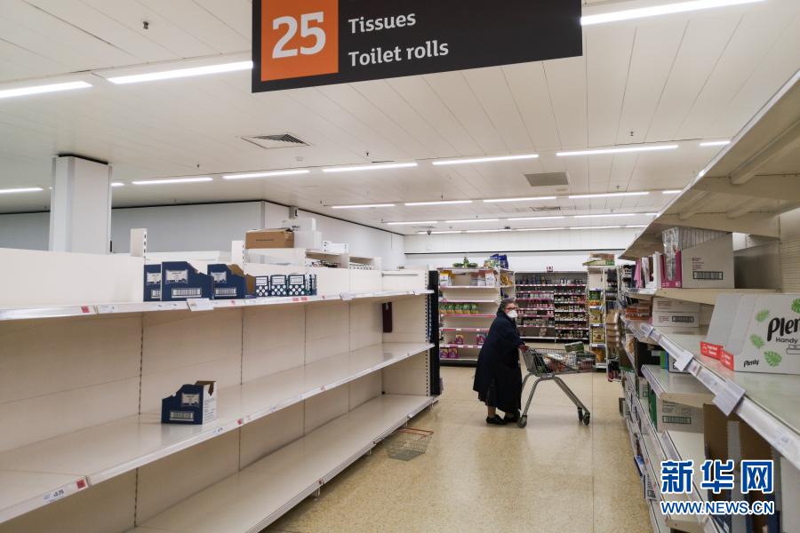 2020年3月20日,在英國(guó)倫敦的一家超市,一名女士從空蕩的貨架旁走過(guò)。新華社發(fā)(喬·紐曼攝)