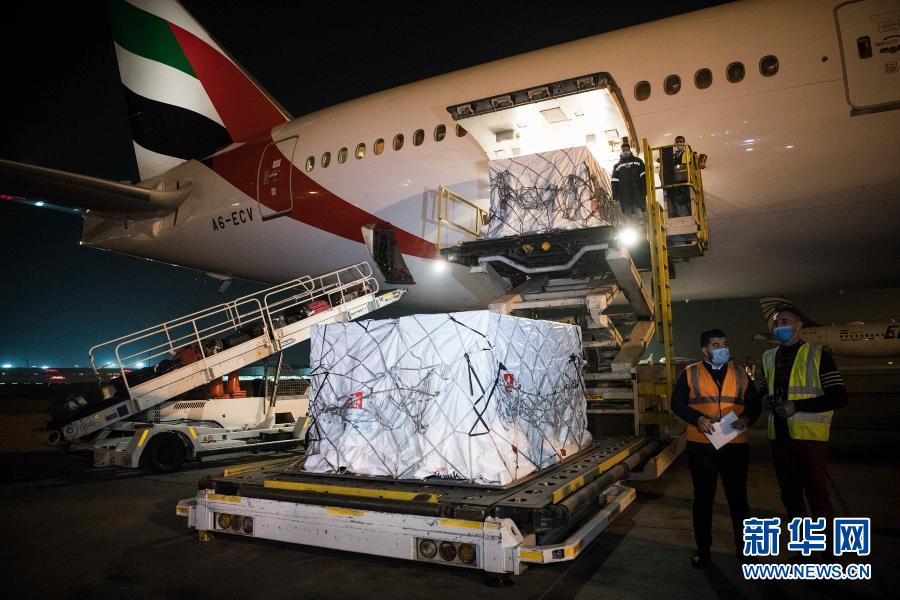 2020年12月10日,在埃及開(kāi)羅國(guó)際機(jī)場(chǎng),工作人員運(yùn)輸中國(guó)研制生產(chǎn)的新冠疫苗。新華社記者鄔惠我攝