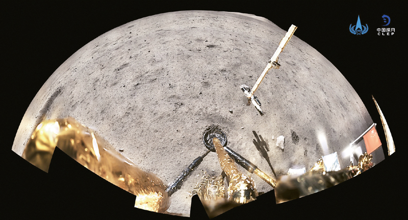 2020年12月4日,國(guó)家航天局公布了探月工程嫦娥五號(hào)探測(cè)器在月球表面國(guó)旗展示的照片。嫦娥五號(hào)著陸器和上升器組合體全景相機(jī)環(huán)拍成像,五星紅旗在月面成功展開(kāi),此外圖像上方可見(jiàn)已完成表取采樣的機(jī)械臂及采樣器。 新華社發(fā)(國(guó)家航天局供圖)
