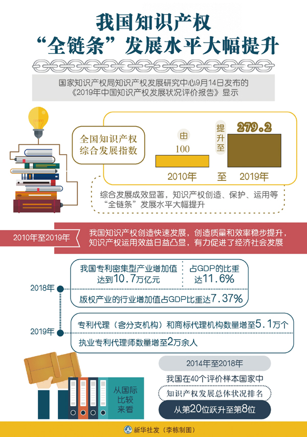 ——在完善法律法規(guī)方面,基本建立起符合國(guó)際通行規(guī)則、門類較為齊全的知識(shí)產(chǎn)權(quán)法律制度,實(shí)現(xiàn)了專利、商標(biāo)、地理標(biāo)志等知識(shí)產(chǎn)權(quán)的全方位、立體化保護(hù)。加入世貿(mào)組織以來(lái),中國(guó)先后多次修訂專利法、商標(biāo)法和著作權(quán)法等法律,基本形成了知識(shí)產(chǎn)權(quán)“嚴(yán)保護(hù)”的法律制度體系。