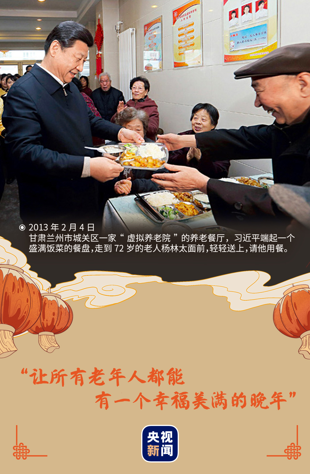 2013年春節(jié)前夕,習(xí)近平總書記來到城關(guān)區(qū)的一家“虛擬養(yǎng)老院”養(yǎng)老餐廳,詳細(xì)了解“虛擬養(yǎng)老院”的運(yùn)行情況,向老人們拜年。