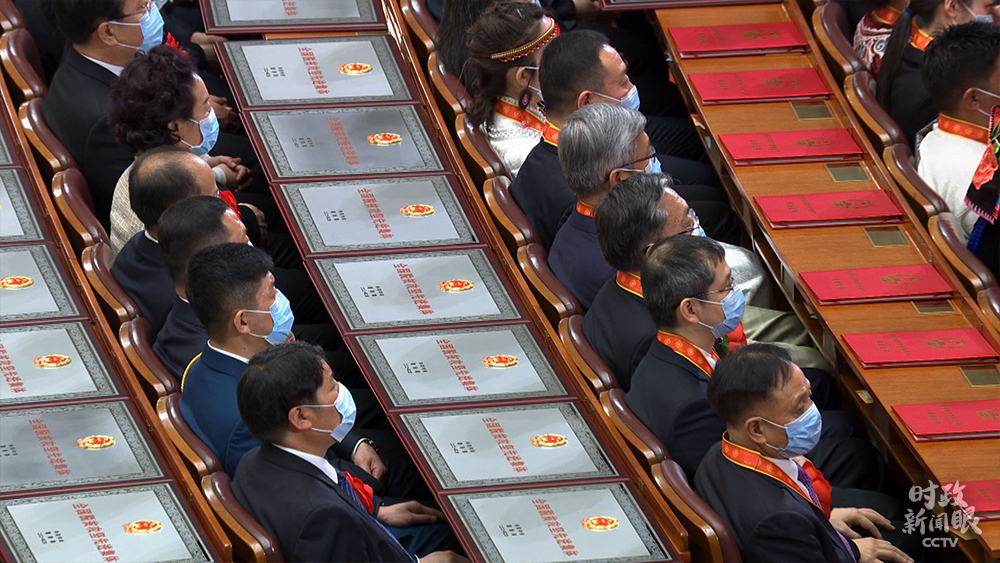 △大會當天,“全國脫貧攻堅楷模”榮譽稱號獲獎者代表受邀在主席臺就座。(總臺央視記者鐘鋒拍攝)