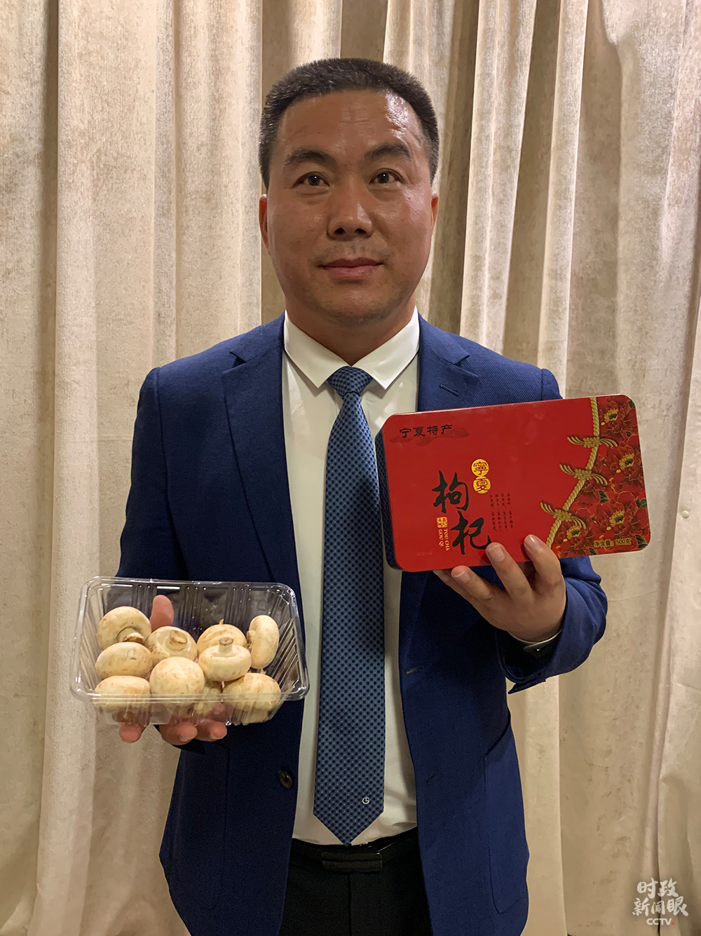 △閩寧鎮(zhèn)黨委書記張文帶來家鄉(xiāng)特產(chǎn)蘑菇、枸杞。(總臺央視記者范一鳴拍攝)