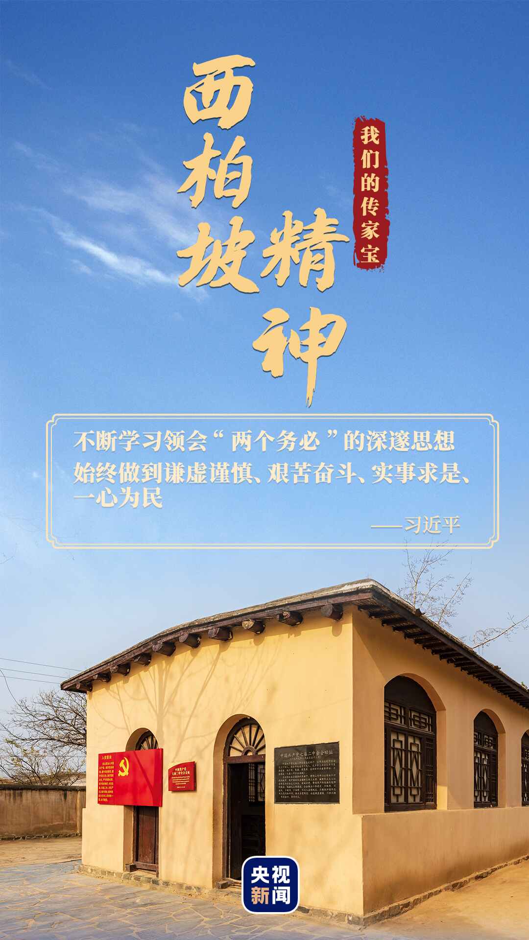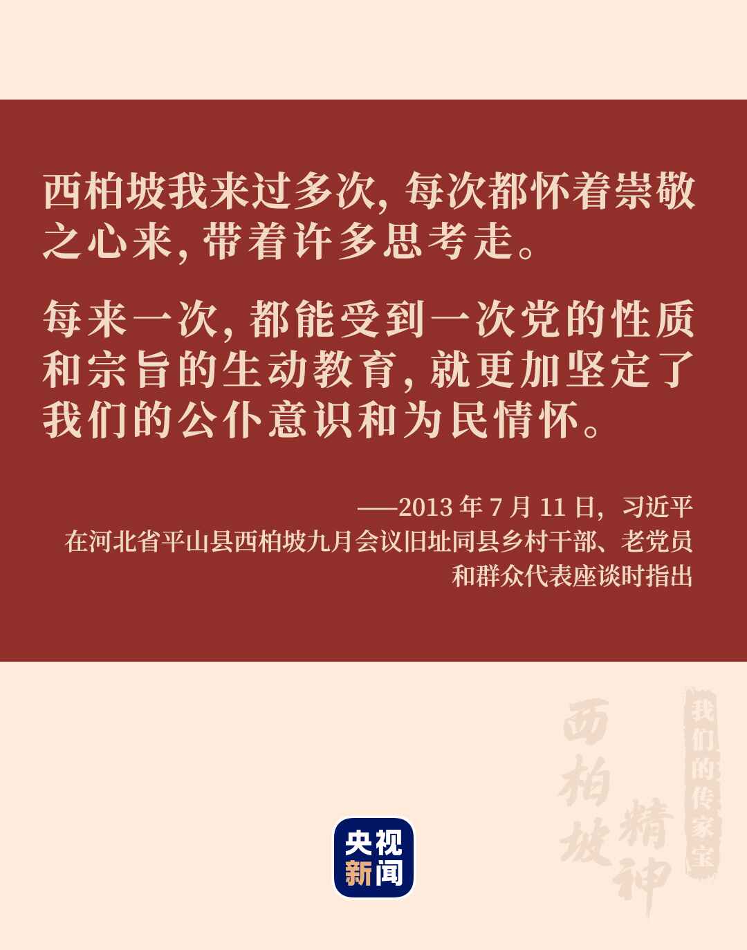 2013年7月,習(xí)近平總書記來到革命圣地西柏坡,瞻仰舊址??倳浱栒偃h同志,要不斷學(xué)習(xí)領(lǐng)會“兩個務(wù)必”的深邃思想,始終做到謙虛謹(jǐn)慎、艱苦奮斗、實事求是、一心為民,繼續(xù)把人民對我們黨的“考試”、把我們黨正在經(jīng)受和將要經(jīng)受各種考驗的“考試”考好,使我們的黨永遠(yuǎn)不變質(zhì)、我們的紅色江山永遠(yuǎn)不變色。