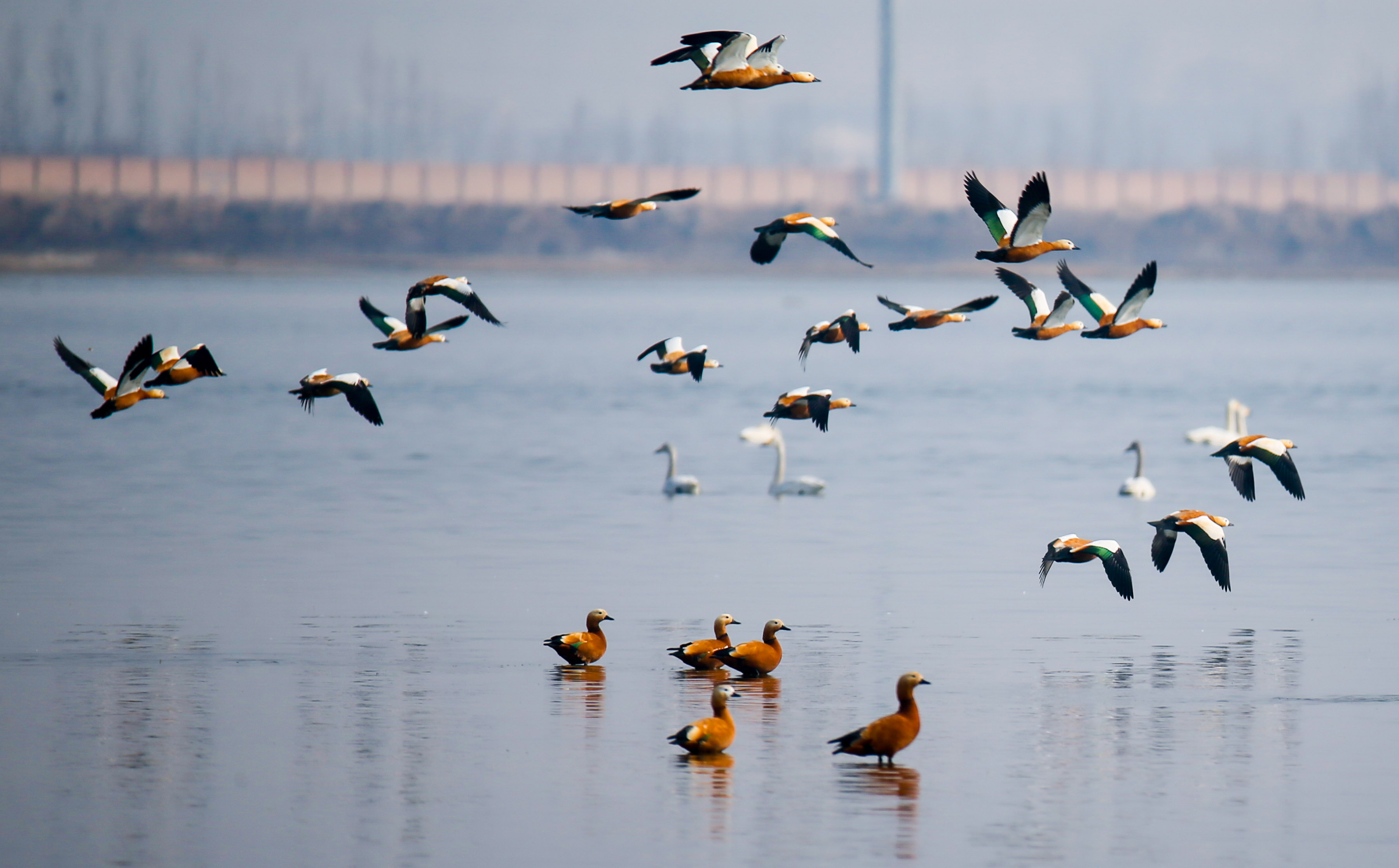 △2021年3月9日,內(nèi)蒙古呼和浩特市土默特左旗的海流水庫(kù),成群的候鳥在水面上嬉戲。