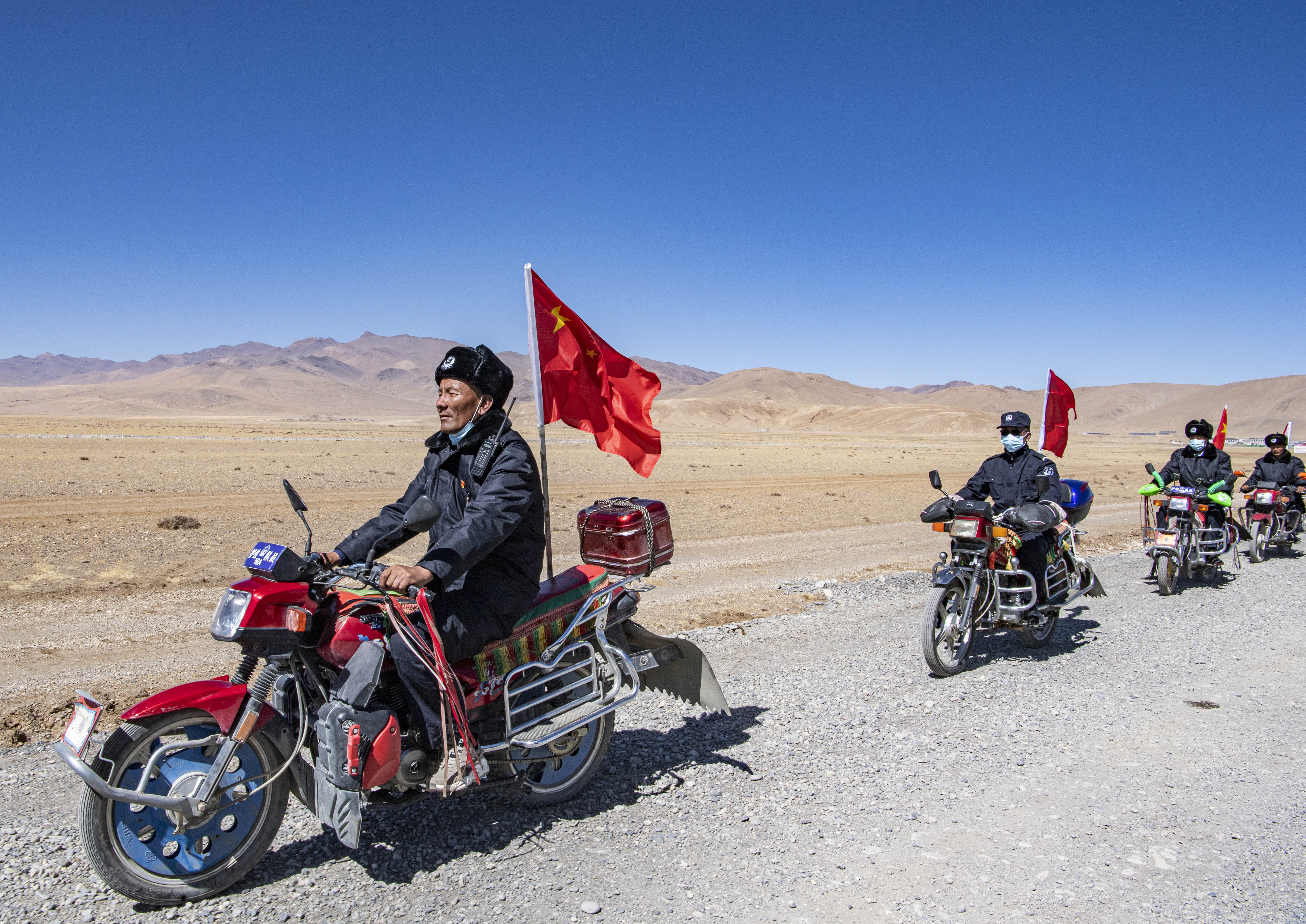 西藏日喀則市薩嘎縣昌果鄉(xiāng)的一處村莊里,48歲的藏族漢子石覺(jué)塔布在風(fēng)中跨上一輛摩托車(chē),向平坦無(wú)垠的高原邊緣騎去。車(chē)尾,一面五星紅旗被風(fēng)吹得獵獵作響。