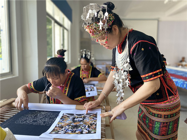 在技藝恢復(fù)的過程中,郭凱的團(tuán)隊(duì)也有意外的收獲。通過對三聯(lián)幅、五聯(lián)幅龍被的復(fù)制,恢復(fù)傳統(tǒng)龍被織造技藝,對黎錦傳統(tǒng)技藝的傳承與發(fā)展具有重要意義;通過對龍被的原材料使用和織造技藝(包括紡染織繡各項(xiàng)技藝)過程編輯形成圖文資料,拍攝形成影像資料,為龍被技藝的保護(hù)、傳承與發(fā)展留下了寶貴的資料和傳播素材;通過開辦龍被刺繡技能培訓(xùn)班,培養(yǎng)了一批刺繡人才,使越來越多的人群能夠掌握傳統(tǒng)特色一技之長,繼而產(chǎn)生富有民族特色的經(jīng)濟(jì)效益和社會(huì)效益,更大程度地傳承民族技藝,并將其發(fā)揚(yáng)光大。