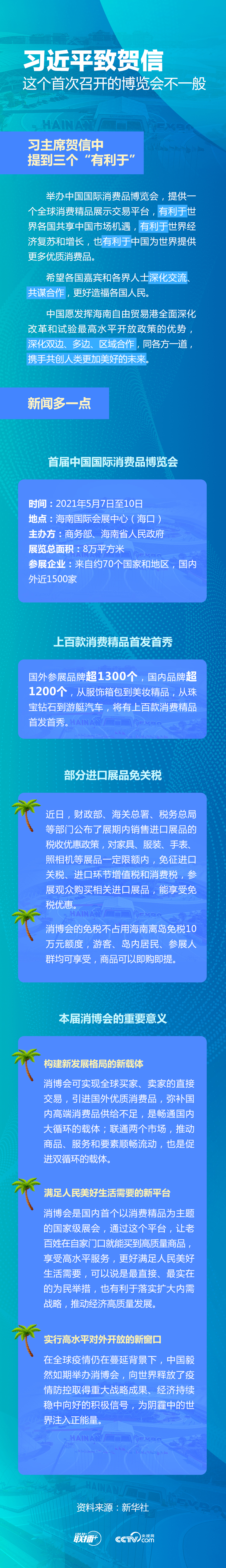 聯(lián)播+“中國愿發(fā)揮海南自由貿(mào)易港全面深化改革和試驗(yàn)最高水平開放政策的優(yōu)勢,深化雙邊、多邊、區(qū)域合作,同各方一道,攜手共創(chuàng)人類更加美好的未來。”5月6日,習(xí)近平主席向首屆中國國際消費(fèi)品博覽會致賀信。