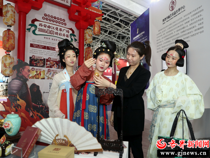 在第五屆絲博會陜文投集團(tuán)展區(qū),身著漢服的工作人員向觀眾介紹文創(chuàng)產(chǎn)品。 記者 杜靜波 攝