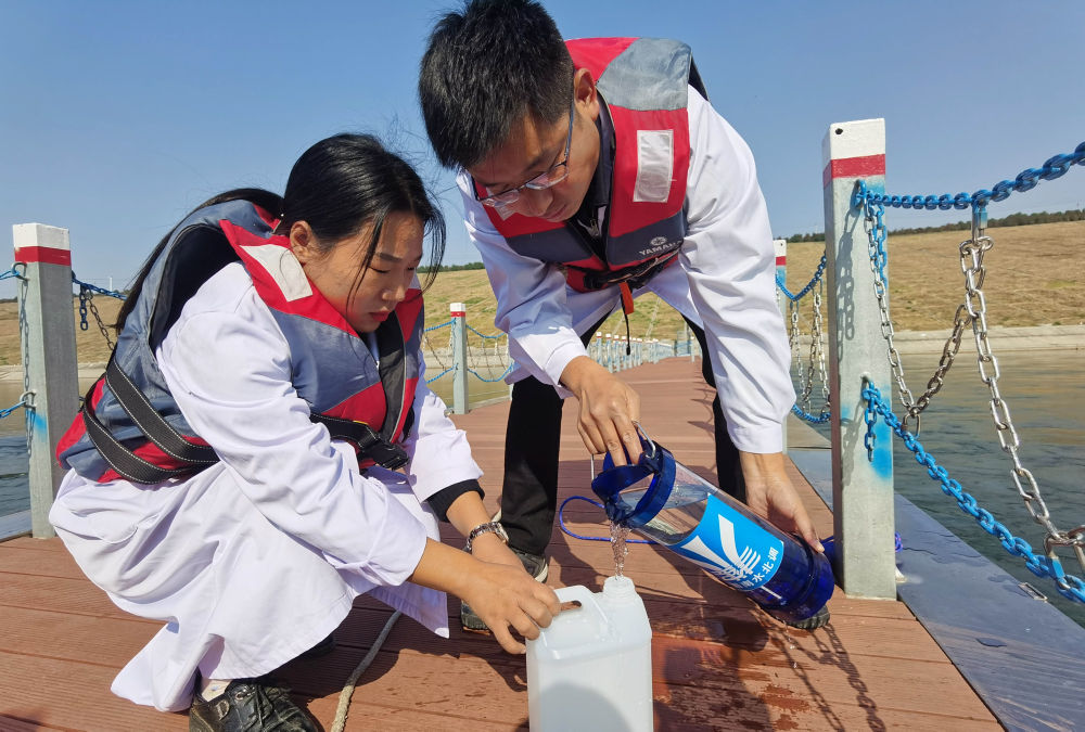 ↑2020年11月12日,工作人員在南水北調中線陶岔渠首監(jiān)測水質。