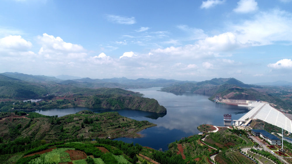 ↑位于河南省汝陽縣前坪村的前坪水庫,是一座以防洪為主,兼具供水、灌溉、發(fā)電功能的大型水利樞紐工程,是國務院確立的172項節(jié)水供水重大水利工程之一(無人機照片,4月26日攝)。