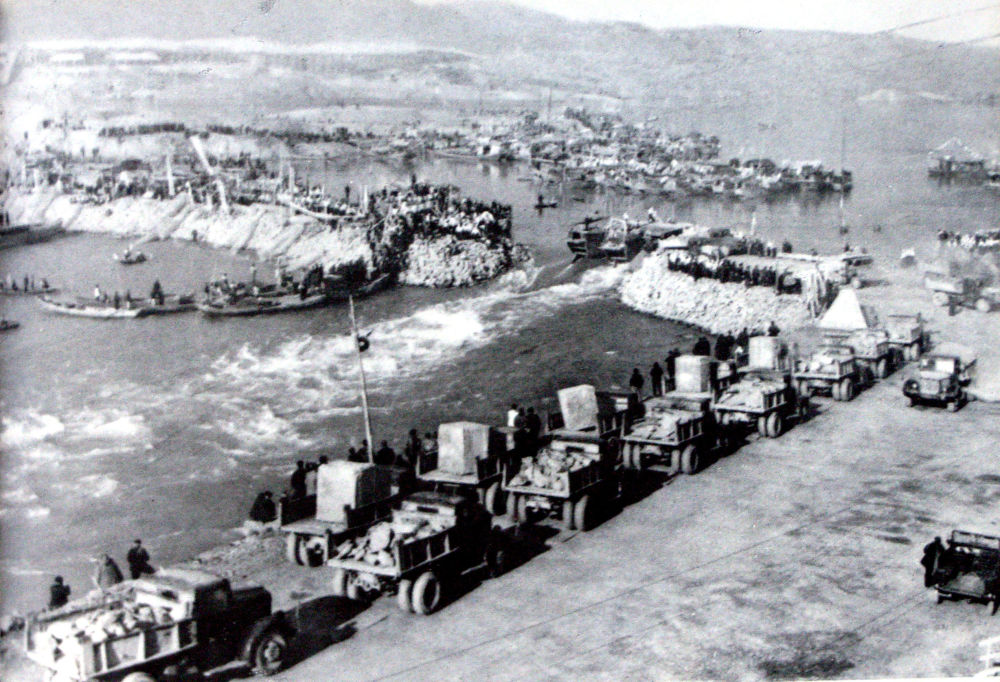 ↑1959年,丹江口大壩建設開始進行漢江截流(資料照片)。