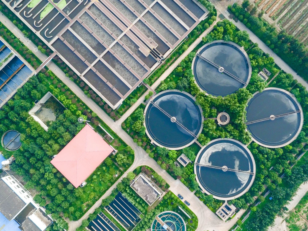 ↑在山東省鄒平縣,污水經(jīng)城市污水處理廠處理,成為當?shù)貪竦毓珗@的水源(無人機照片,2016年7月26日攝)。