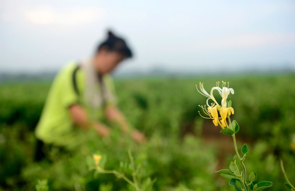 ↑農(nóng)民在河南省淅川縣九重鎮(zhèn)中藥材種植基地采摘金銀花(2016年7月30日攝)。位于南水北調中線一期工程水源地的淅川縣,通過發(fā)展金銀花、軟籽石榴、有機蔬菜等綠色生態(tài)產(chǎn)業(yè),實現(xiàn)了生態(tài)保護和百姓增收的平衡發(fā)展。