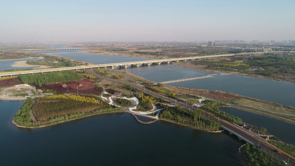 ↑南水北調生態(tài)補水,讓干涸了幾十年的石家莊母親河——滹沱河重現(xiàn)生機(無人機照片,2021年4月13日攝)。