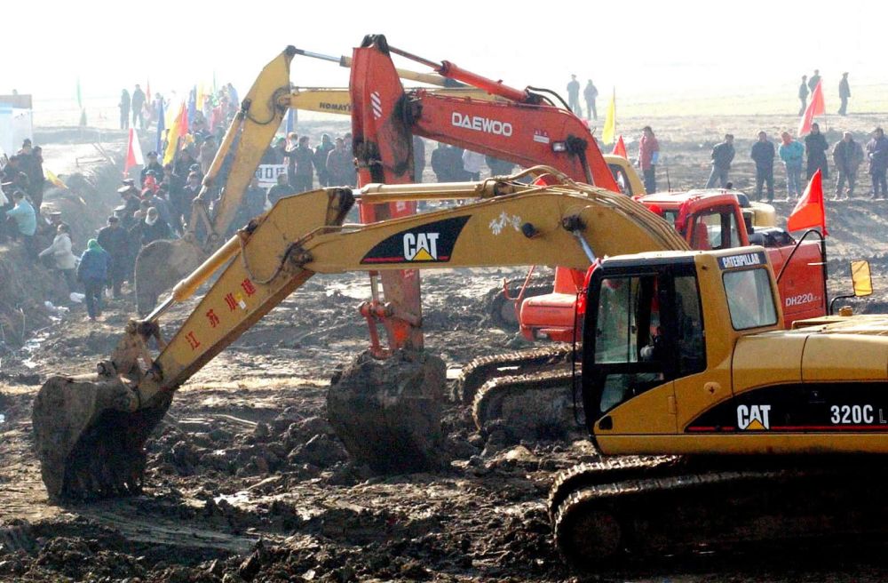 ↑2002年12月27日在江蘇揚州寶應縣南水北調東線工程潼河工地拍攝的施工現(xiàn)場。南水北調工程在這一天正式開工建設。